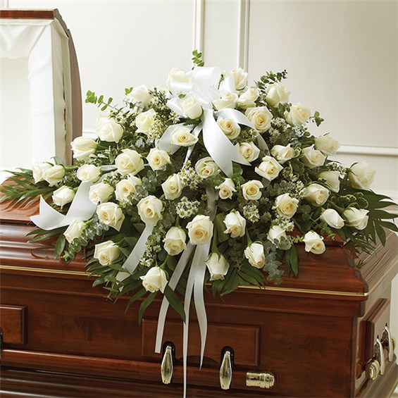 The precious moments spent with loved ones are the moments we want to hold onto forever. Capture this sentiment with a timeless display of all white. Our half casket cover, crafted with care and artistry by our expert florists with over 50 snow white roses, white monte casino, and accented with a white satin ribbon, is an unforgettable way to commemorate a lifetime of shared loving experiences. •Half casket cover arrangement of white roses, monte casino and fresh greenery; accented with a white satin ribbon •Arrangement measures approximately 16"H x 42"L x 28"D •Traditionally sent by the immediate family to the funeral home •Our florists use only the freshest flowers available, so colors and varieties may vary